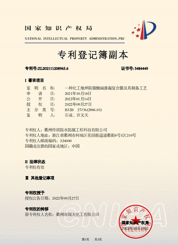 衢州傳祺新材料科技有限公司是衢州市聞天化工有限公司的下屬企業(yè);衢州市聞天化工有限公司成立于2003年,是國(guó)內(nèi)最早研發(fā)、生產(chǎn)氟碳涂料的企業(yè)之一。衢州傳祺新材料科技有限公司成立于2017年,公司專注于高分子氟材料的開發(fā)和含氟材料在防腐、防水領(lǐng)域的應(yīng)用。經(jīng)過(guò)6年的不懈努力,已獲得了化工和建筑領(lǐng)域六項(xiàng)國(guó)家發(fā)明專利授權(quán)和兩項(xiàng)新產(chǎn)品科技成果獎(jiǎng),參與了中國(guó)建筑材料流通協(xié)會(huì)《房屋修繕?lè)浪こ桃?guī)范》標(biāo)準(zhǔn)的編制工作,中建協(xié)涂裝委員會(huì)浙西工作站設(shè)立在我公司。
